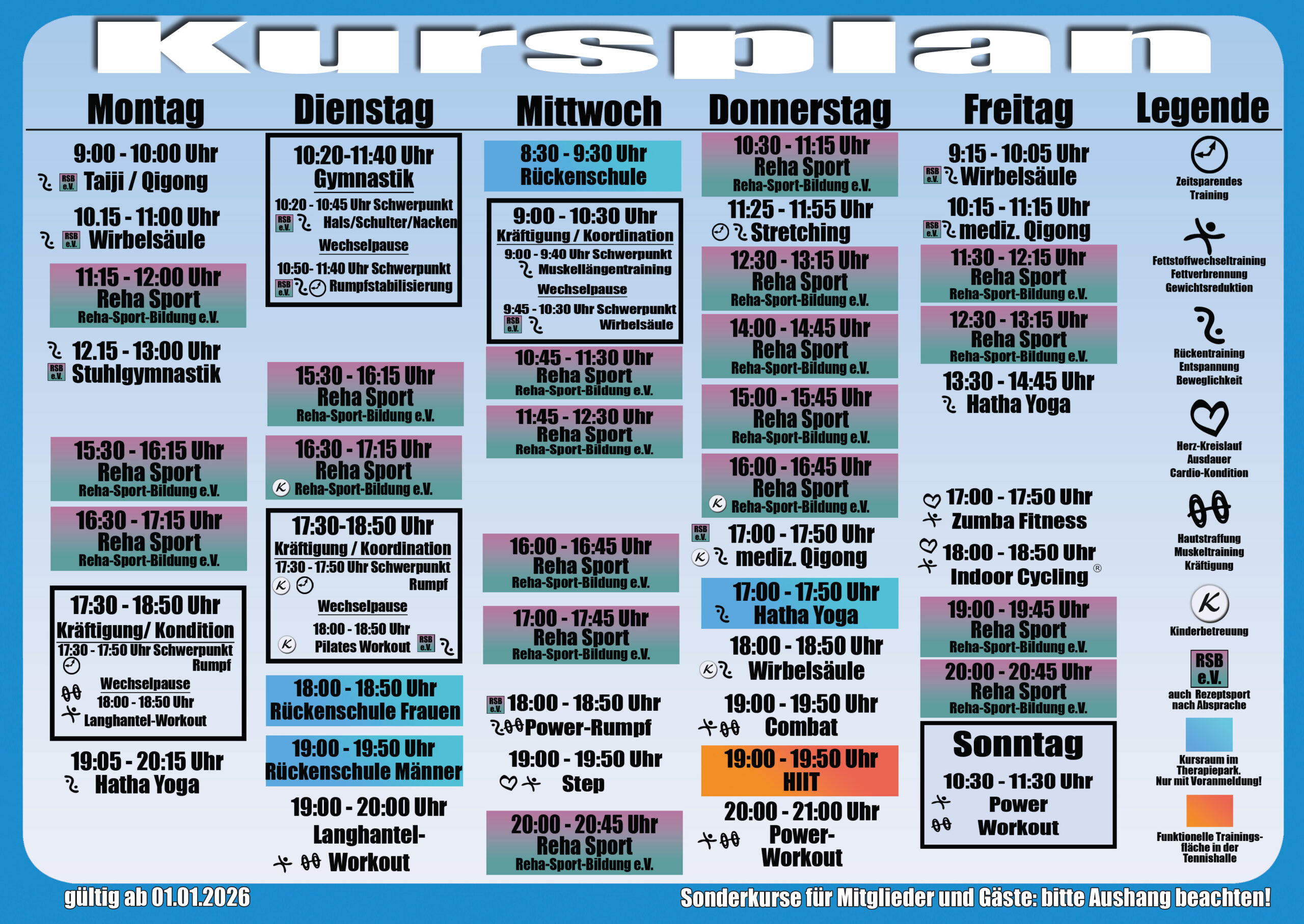 Entdecken Sie unser vielseitiges Kursangebot und trainieren Sie gemeinsam in motivierender Atmosphäre. Mit über 1.700 Minuten Kursprogramm pro Woche bieten wir Ihnen eine große Auswahl an Kursen – egal, ob Sie Ihre Kraft und Ausdauer steigern, Ihren Rücken stärken oder in der Rehabilitation aktiv werden möchten.
